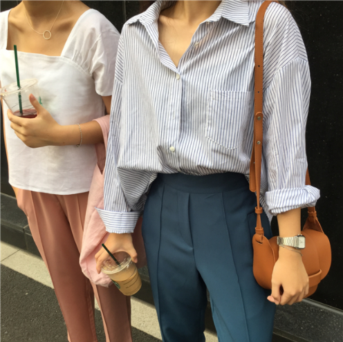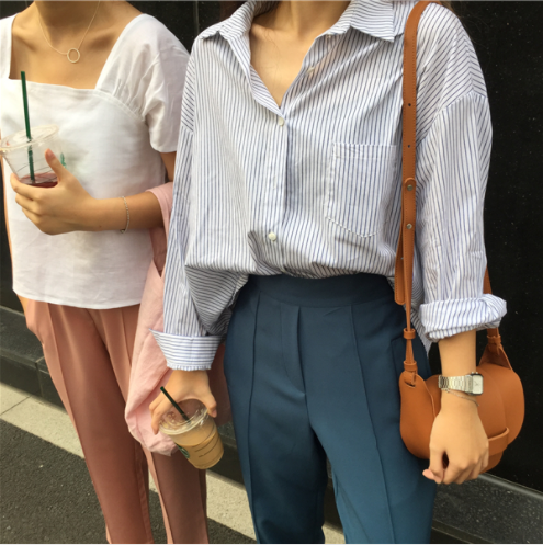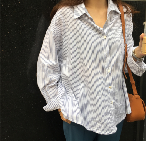 早秋女装韩版简约百搭宽松学生翻领排扣衬衫