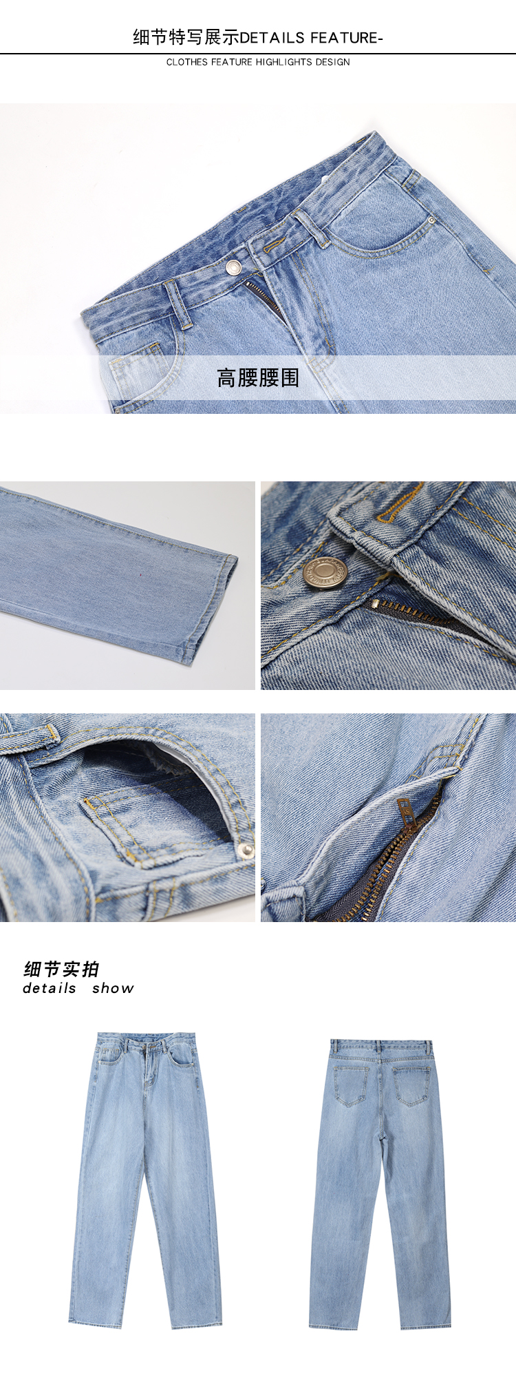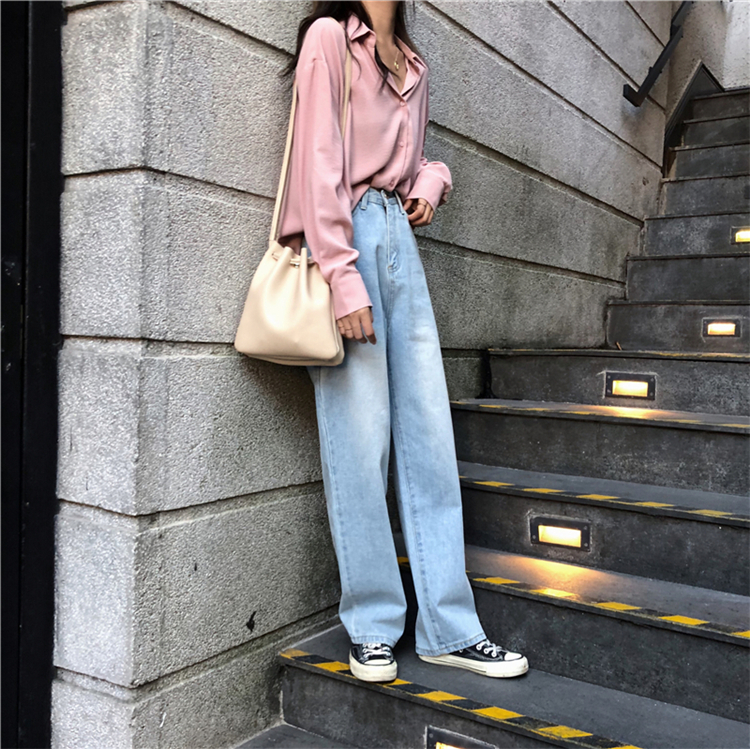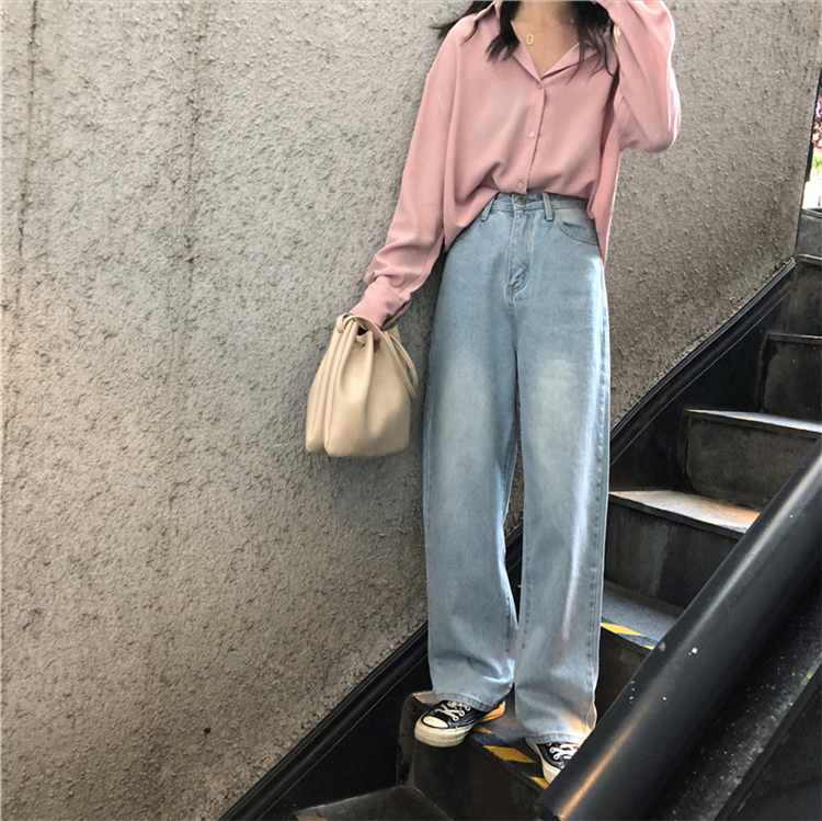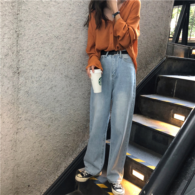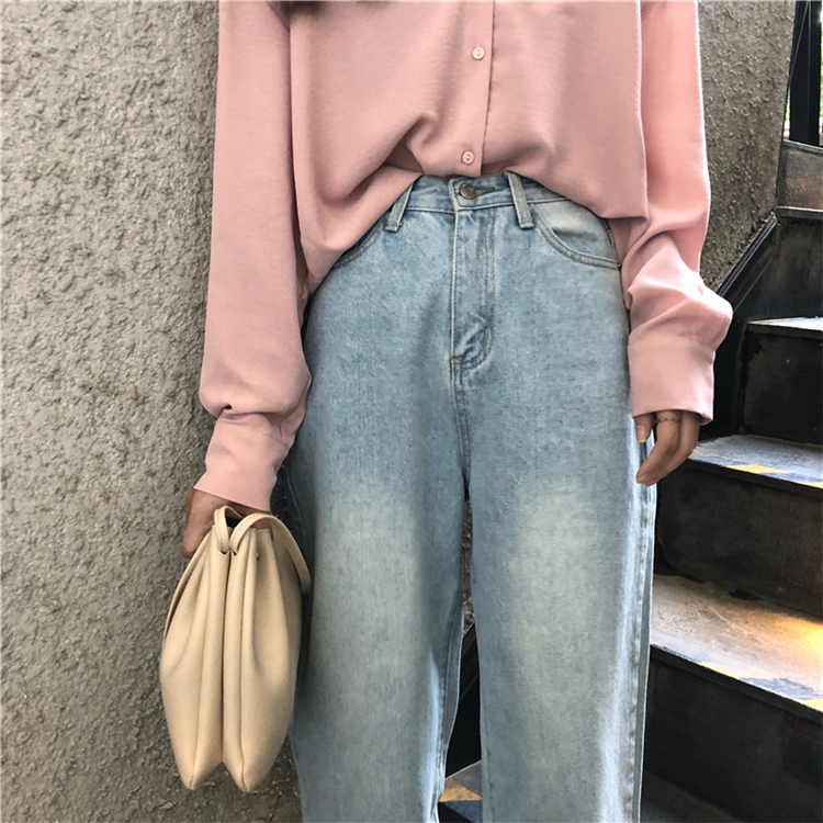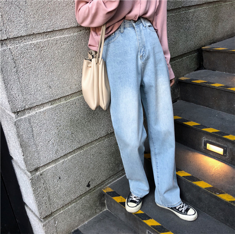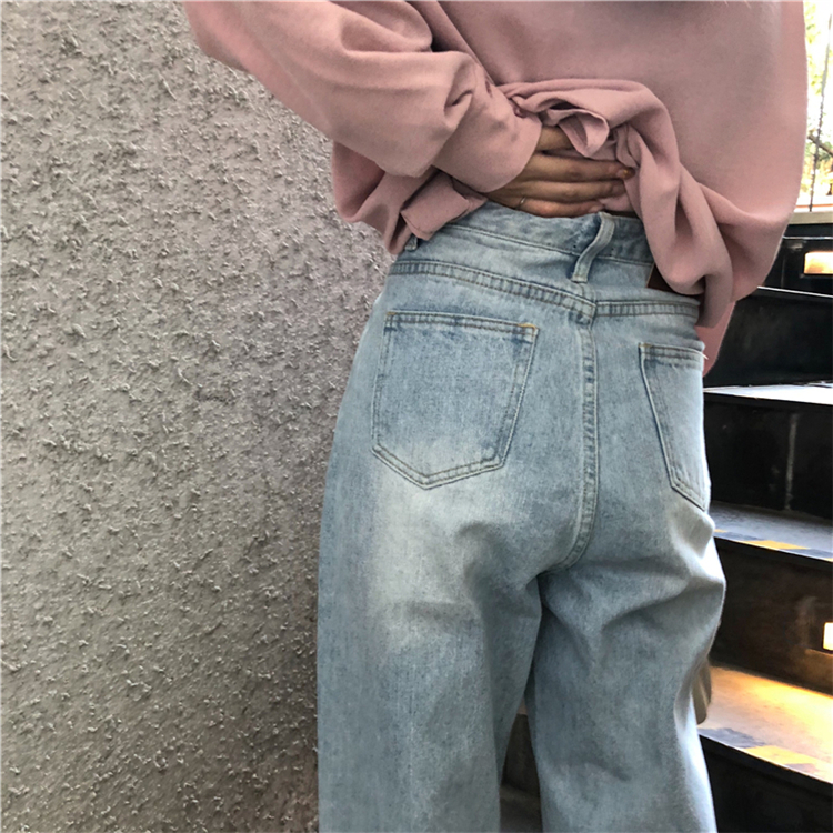 韩版秋季复古百搭宽松高腰做旧磨白直筒牛仔